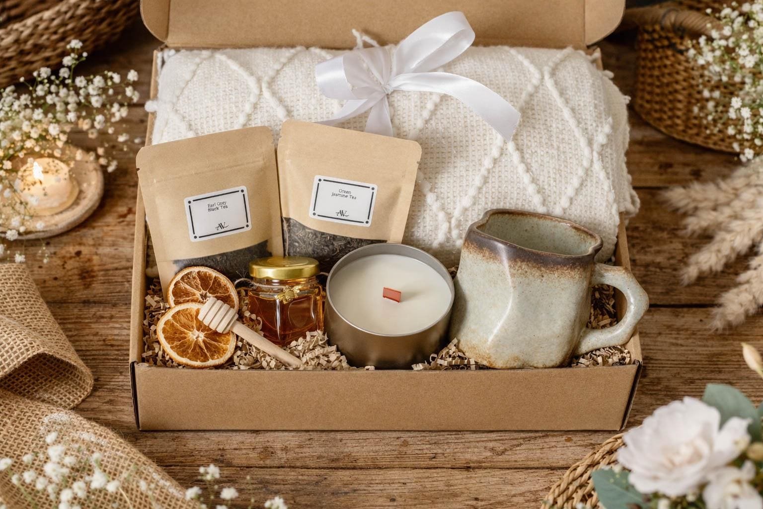 Cozy Hygge Gift Box | Knitted Blanket, Ceramic Mug, Tea, Honey, Candle