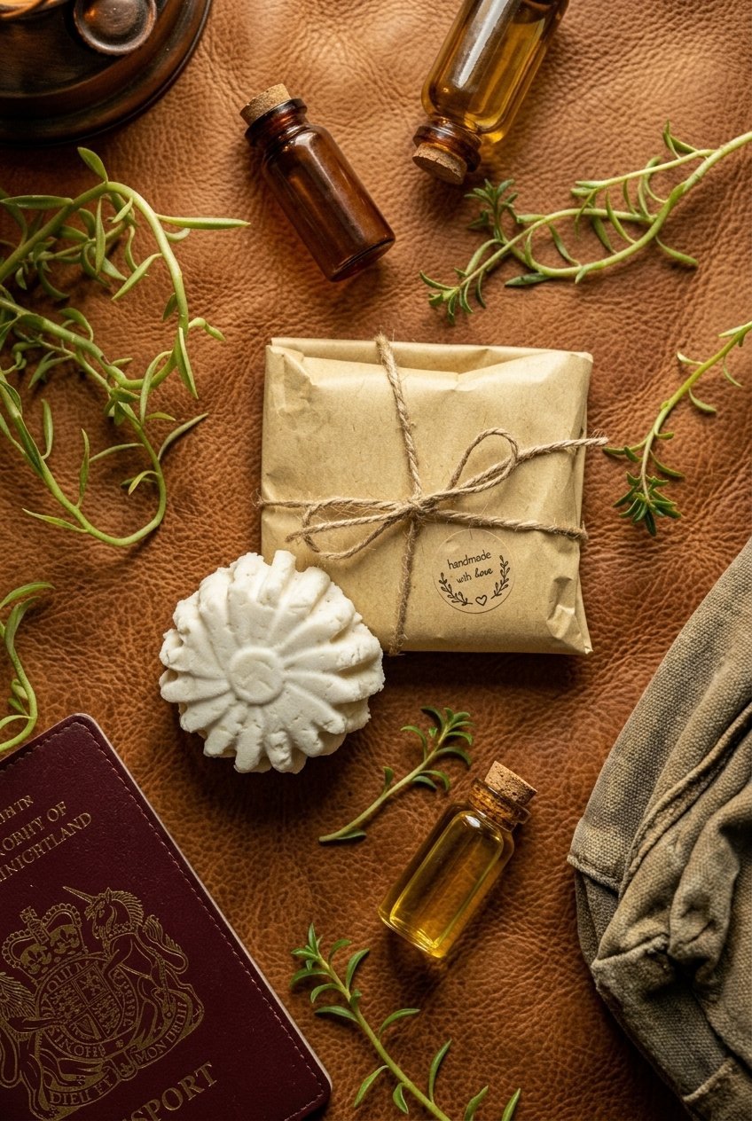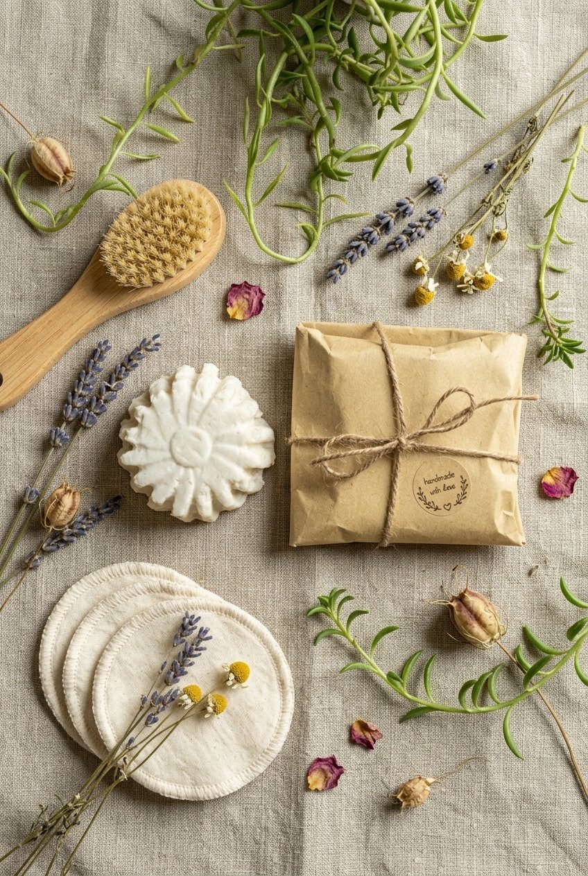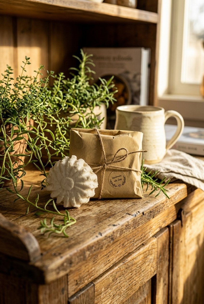 Sale! A green rosemary solid shampoo bar with castor oil, shaped like a flower, is placed on a wooden surface next to a kraft paper package tied with twine. The package has a label that reads "handmade with love," surrounded by green leafy sprigs.