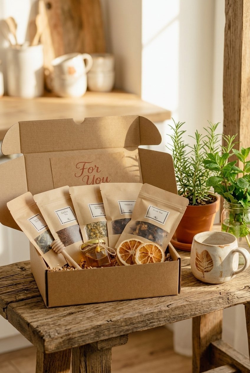 Handmade gift set with Jar of Natural Honey, Chamomile Tea, Fruit Tea Blend, Wooden honey dipper. Thoughtfully crafted with natural ingredients.