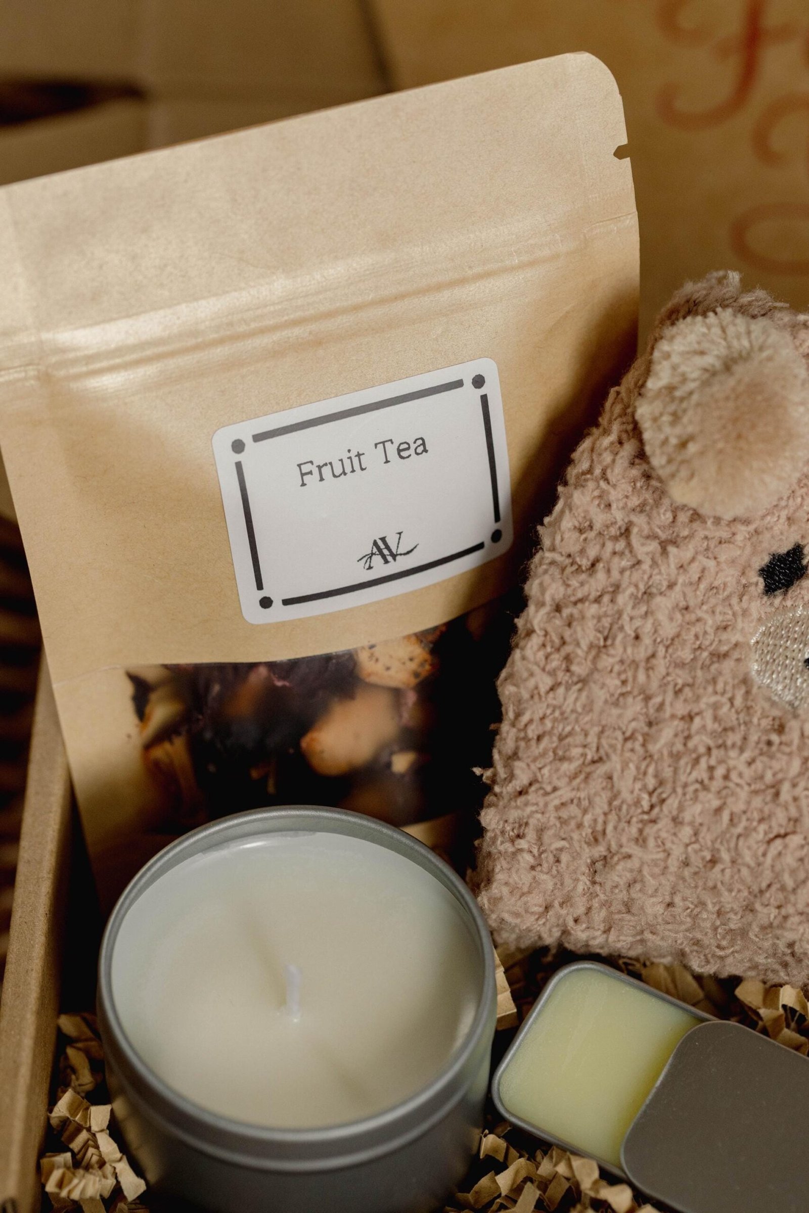 Handmade gift set with Fruit Tea, lip balm, candle, cute socks. Thoughtfully crafted with natural ingredients.