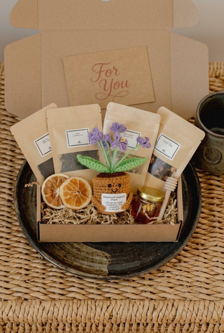 Give your loved one a moment of calm, comfort, and heartfelt attention with this beautifully curated gift set. Designed to delight the senses and warm the soul, it’s the perfect present for any occasion — from birthdays and holidays to simple acts of love and appreciation. Inside the box, you’ll find four carefully selected teas, each offering its own unique mood. To make every cup even more special, the set includes a jar of natural honey, adding a touch of sweetness and warmth to each sip. And as a truly charming finishing touch, you’ll discover a Crochet Emotional Support Plant — a cute, handmade companion that brings a smile, comfort, and a reminder that someone cares. It’s a small detail with a big emotional impact . This gift box is more than just tea — it’s an experience, a hug in a box, and a thoughtful way to say “I’m thinking of you.” Perfect for gifting to friends, family, partners, or anyone who deserves a little extra care. This thoughtfully curated set includes: Chamomile Tea (0.3 oz) Fruit Tea Blend (0.7 oz) Earl Grey Black Tea (0.6 oz) Jasmine Green Tea (0.6 oz) Crochet Emotional Support Plant Two dried orange slices for a beautiful citrus aroma Jar of Natural Honey – pairs beautifully with every cup (1.8 oz) Wooden honey dipper Personalized Craft Gift Card where you can add your special message Choose if you would like to add Cozy Socks, a Tea Strainers, or both to your gift set. Select “None” if you prefer the original set only. Perfect Gift For: Birthday gifts Holiday & Christmas gifts Mother’s Day Anniversary or Valentine’s Day Get-well & care packages ️ Self-care & stress-relief gifts Create a hygge moment for yourself or someone you love Allergy Warning: Please carefully review the ingredient list before use. If you have a known allergy to any of the ingredients in this product, do not use it. If you experience any signs of an allergic reaction, stop using the product immediately.