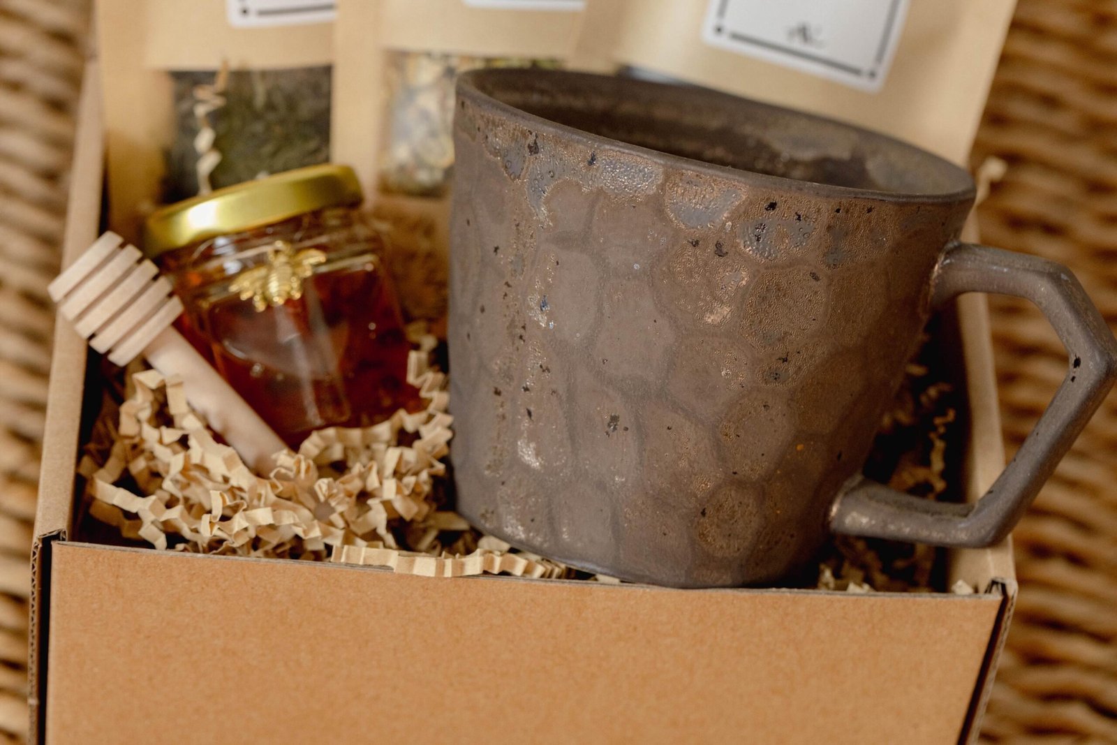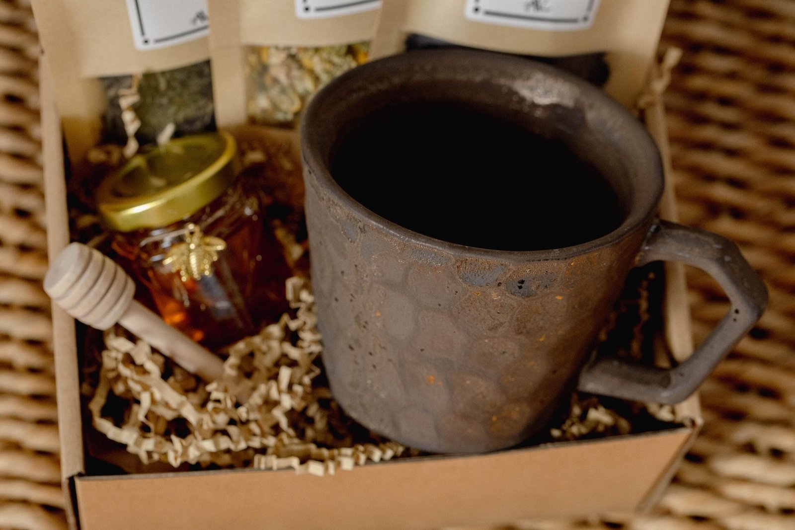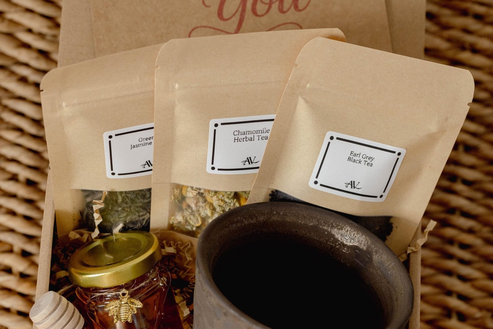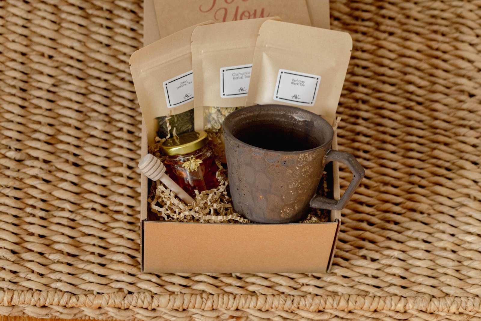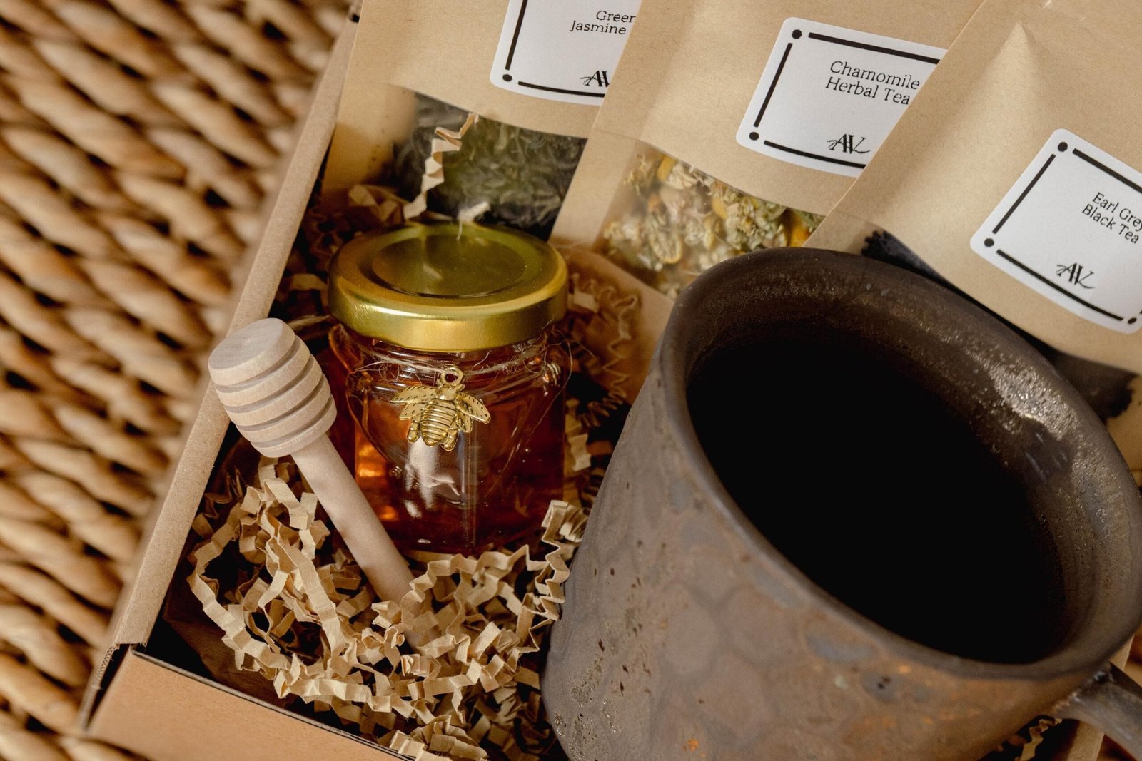 Handmade gift set with Jar of Natural Honey, Wooden honey dipper, Earl Grey Black Tea, Jasmine Green Tea. Thoughtfully crafted with natural ingredients.